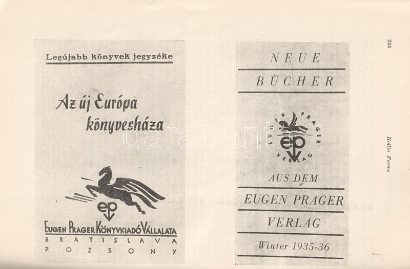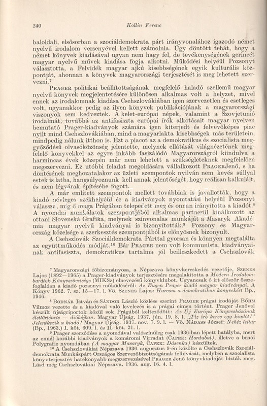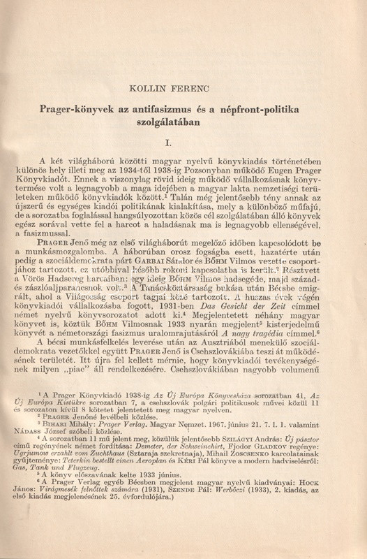 Kollin Ferenc sajtótörténész, antikvárius rövid cikke a mindössze öt évig, 1934 és 1938 között működő, szociáldemokrata irányzatú pozsonyi magyar kiadó, az Eugen Prager Könyvkiadó kiadáspolitikáját ismerteti. A tulajdonos, Prager Jenő a Tanácsköztársaságban vállalt szerepe után Bécsbe emigrált, majd Prágába tette át működése színhelyét: innen igazgatta pozsonyi könyvkiadója munkáját. A rövid, néhány szövegközti felvétellel illusztrált munka korjellemző fordulatokkal magasztalja a könyvkiadó baloldali szemléletű politikai és irodalmi könyvkiadói tevékenységét (antifasiszta könyvek, fasizálódó-félfasiszta Magyarország). Ugyanakkor értékes könyvészeti adatokat oszt meg a kiadó irodalmi sorozatairól, politikai pamfleteiről és általánosságban a határon túli magyar könyvpiac kiadáspolitikájáról. Kollin Ferenc munkája később, jelentős kibővítést követően könyv formájában is megjelent, "A Prager Könyvkiadó története" címmel (Budapest, 1977).