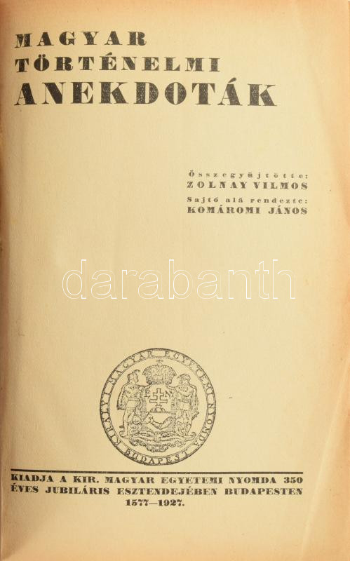 Magyar történelmi anekdoták. Összegyűjtötte: Zolnay Vilmos. Sajtó alá rendezte: Komáromi János. Bp., 1927, Kir. M. Egyetemi Nyomda, 185+(3) p. Kiadói kartonált papírkötés,