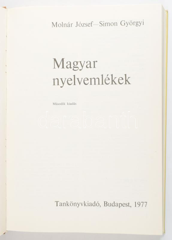 Molnár József-Simon Györgyi: Magyar nyelvemlékek. Bp., 1977. Tankönyvk... https://www.darabanth.com/de/514-Auktion-Philatelie-Postkarten-Numismatik-Kunstwerke-Bucher-Schreibwaren-Schmuck/515.0/Bucher/Bucher-Geschichte~617/Molnar-Jozsef-Simon-Gyorgyi-Magyar-nyelvemlekek-Bp-1977-Tankonyvkiado-Kiadoi-egeszvas~II3459413