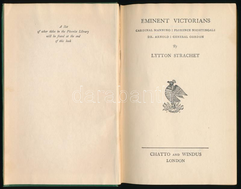 Strachey, Lytton: Eminent Victorians. (Cardinal Manning - Florence Nightingale - Dr. Arnold - General Gordon). London, 1929, Chatto and Windus, IX+(3)+302+(8) p. Angol nyelven. Kiadói aranyozott gerincű egészvászon-kötés, jó állapotban. / In English language. Hardcover, in good condition.