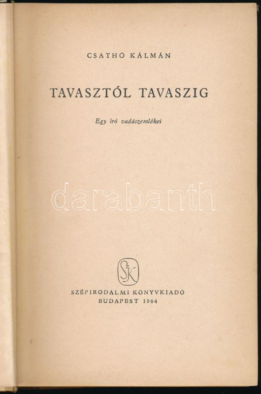 Csathó Kálmán: Tavasztól tavaszig. Egy író vadászemlékei. Bp., 1964, S... https://www.darabanth.com/de/514-Auktion-Philatelie-Postkarten-Numismatik-Kunstwerke-Bucher-Schreibwaren-Schmuck/515.0/Bucher/Bucher-Jagd~621/Csatho-Kalman-Tavasztol-tavaszig-Egy-iro-vadaszemlekei-Bp-1964-Szepirodalmi-Felvas~II3476433