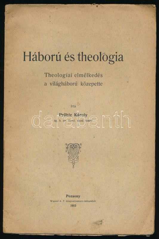 Pröhle Károly: Háború és theologia. Theologiai elmélkedés a világháború közepette. Pozsony, 1915, Wigand K. F.-ny., 32 p. Kiadói papírkötés, helyenként kissé foltos. (Ritka!)
