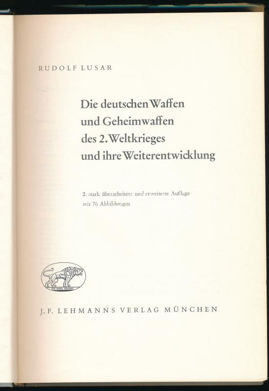 Rudolf Lusar: Die deutschen Waffen und Geheimwaffen des 2. Weltkrieges und ihre Weiterentwicklung. München, 1958, J. F. Lehmanns Verlag. Német nyelven. Kiadói egészvászon-kötés, kiadói papír védőborítóban.