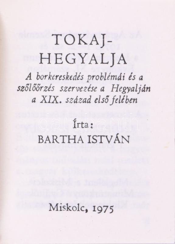 Bartha István: Tokaj-Hegyalja. A borkereskedés problémái és a szőlőőrzés szervezése a Hegyalján a XIX. század első felében. Miskolc, 1975., Miskolci Minatűrkönyv Gyűjtők Klubja. Minikönyv, 865. sorszámozott példány, készült 1000 számozott példányban, könyvárusi forgalomba nem került. Andruskó Károly (1915-2008) fametszetű minatűr ex libris-szével. Kiadói aranyozott műbőr kötésben, kopott borítóval, jó állaptban.
