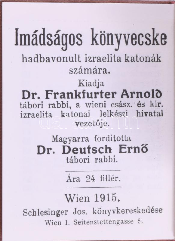 Hadbavonult izrealita katonák imakönyve 1915. Hn., én., nyn. Modern, r... https://www.darabanth.com/de/514-Auktion-Philatelie-Postkarten-Numismatik-Kunstwerke-Bucher-Schreibwaren-Schmuck/515.0/Bucher/Bucher-Minibucher~630/Hadbavonult-izrealita-katonak-imakonyve-1915-Hn-en-nyn-Modern-reprint-minikonyv-Kiadoi-~II3477677