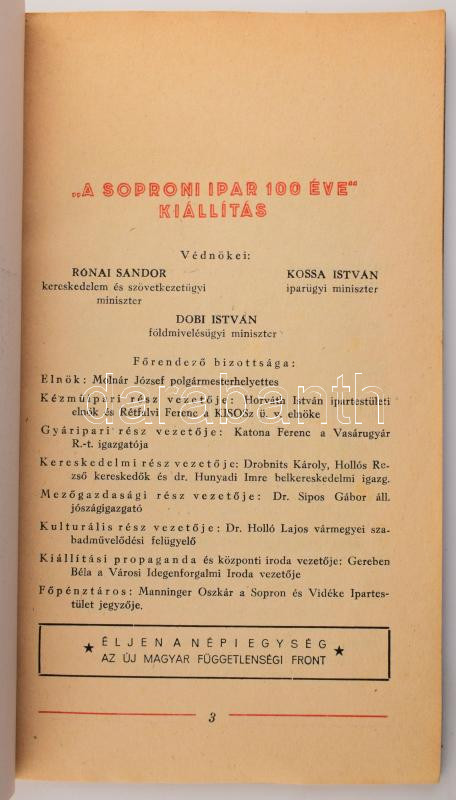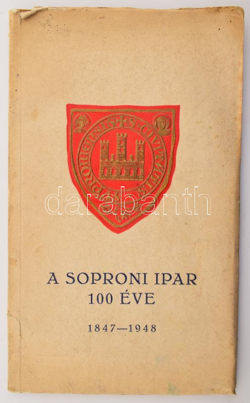 A soproni ipar 100 éve. 1847-1948. Kiállítási katalógus. Sopron, 1948, Röttig-Romwalter Nyomda Rt, 42 p. + 9 ( egy színes, a többi fekete-fehér) t. Kiadói papírkötés, foltos borítóval, rajta kis szakadással, a hátsó borítón rajzokkal, a hátsó borító belsején ceruzás bejegyzéssel.