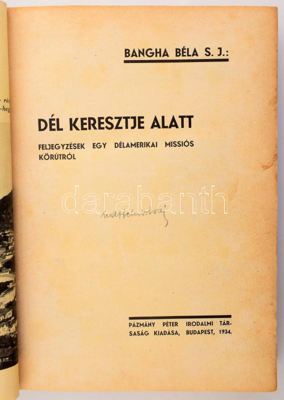 Bangha Béla: Dél keresztje alatt. Feljegyzések egy délamerikai missiós körútról. Bp., 1934, Pázmány Péter Irodalmi Társaság. Fekete fehér fotókkal illusztrálva. Kiadói egészvászon-kötés, kopott, foltos borítóval.