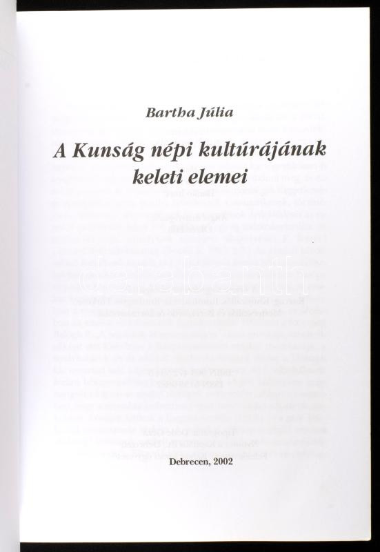 Bartha Júlia: A Kunság népi kultúrájának keleti elemei. Debrecen, 2002 Kiadói papírkötés. A hátsó borító és több lap sarka gyűrött