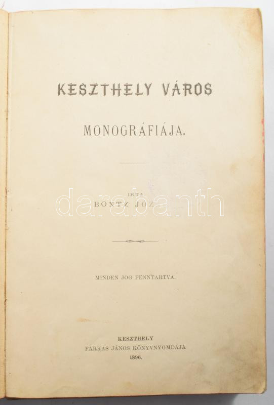 Bontz József: Keszthely város monográfiája. Keszthely, 1896, Farkas János-ny., 490+[4] p.+ 3 (fekete-fehér képek) t.+ 1 (kihajtható) t. Egyetlen kiadás. Kiadói egészvászon-kötés, viseltes állapotban, kopott borítóval, laza fűzéssel, helyenként foltos lapokkal, a hátsó szennylap sérült, a kihajtható tábla szakadt.