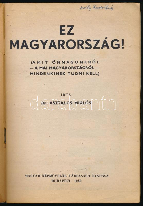Dr. Asztalos Miklós: Ez Magyarország! (Amit önmagunkról - a mai Magyarországról - mindenkinek tudnia kell). Bp. 1940, magyar Népművelők Társasága. 126p. Kiadói papírkötés, laminált, sok képpel, tollal írt megjegyzésekkel.
