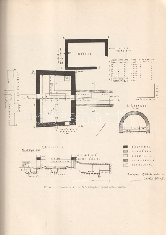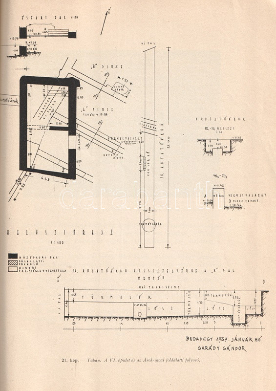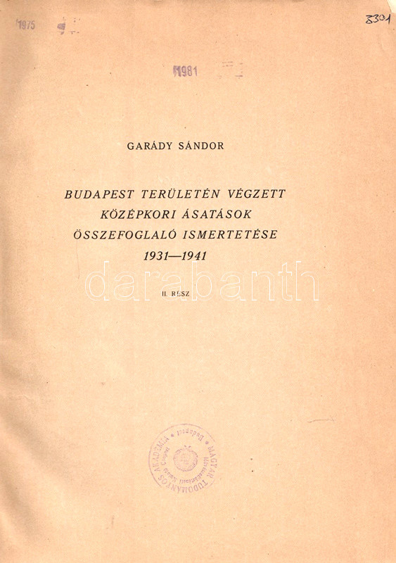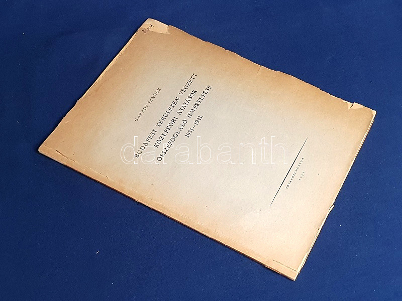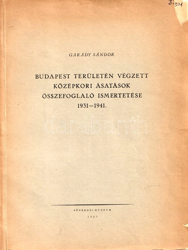 Garády Sándor (1871-1945) kultúrmérnök és régész. Régészeti munkásságát nyugdíjazása után fejtette ki, döntően Buda és Óbuda középkori és török kori ásatásain dolgozott. Oldalszámozáson belül igen gazdag egész oldalas és szövegközti leletfotókkal, alaprajzi és keresztmetszeti ábrákkal, ásatási felvételekkel illusztrált beszámolója a Tabánt érintő régészeti munkájának dokumentációja. A címlapon és a belív több oldalán régi gyűjteményi bélyegzés.