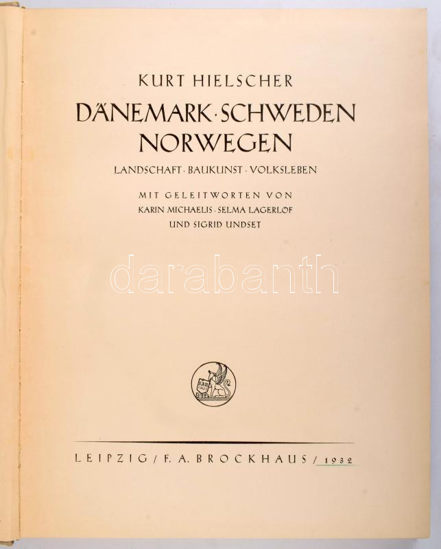 Hielscher, Kurt: Dänemark, Schweden, Norwegen, Landschaft, Baukunst, , Volksleben. Mit Geleitworten von Karin Michaelis, Selma Lagerlöf und Sigrid Undset, gewidmet Sven Hedin. Leipzig, 1932, Brockhaus. Kiadói egészvászon kötés, jó állapotban.