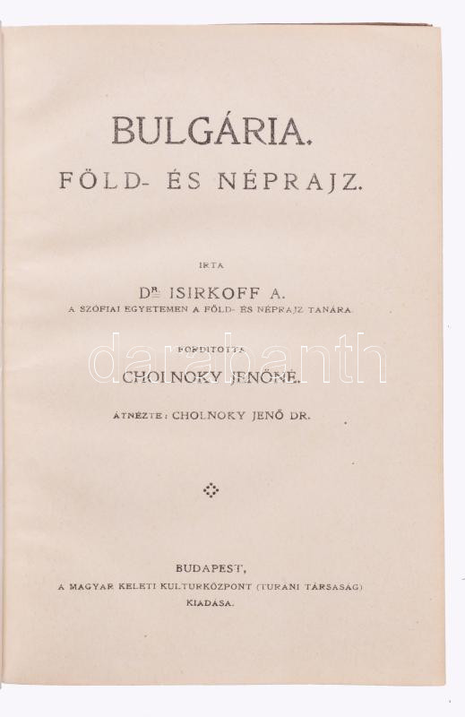 Isirkoff, A[nasztasz Todorov]: Bulgária. Föld- és néprajz. Ford.: Cholnoky Jenőné. Átnézte Cholnoky Jenő. Turáni Könyvtár I. köt. Bp.,(1917)., Magyar Keleti Kultúrközpont - Turáni Társaság, (Fritz Ármin ny.), 162 p. + 48 t. (fotóanyag). Egyetlen kiadás. Az 1910-ben alapított Kelet-kutató és őstörténeti társaság új alapítású könyvtárának, a Turáni könyvtárnak első kötete. Az első világháború utolsó éveiben kiadott kötet apropójául nem csupán a bolgár nép távolabbi értelemben vett rokonsága szolgált, hanem az a tény is, hogy Bulgária 1916 ősze óta a központi hatalmak oldalán belépett az első világháborúba, tehát az Osztrák-Magyar Monarchia fontos szövetségesének számított. A munka első része természetrajzi, a második rész társadalomföldrajzi jellegű. Kiadói félvászon-kötés, kopott borítóval, sérült gerinccel.