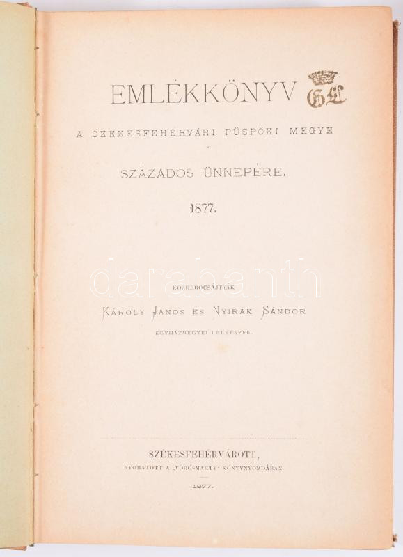 Károly János - Nyirák Sándor: Emlékkönyv a székesfehérvári püspöki megye százados ünnepére. 1877. Közrebocsájtják: - - . Székesfehérvár, 1877, Vörösmarty-ny., 369+[1] p. Aranyozott gerincű egészvászon-kötésben, kissé foltos, részben kissé fakó borítóval, nagyrészt jó állapotban.
