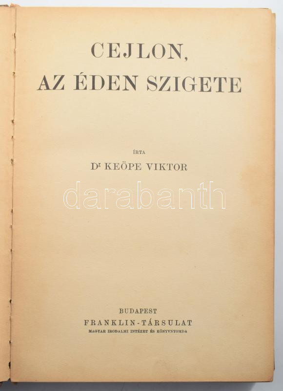 Keöpe Viktor: Cejlon, az éden szigete. Magyar Földrajzi Társaság Könyvtára. Bp., [1934], Franklin-Társulat, 189+(3) p.+ 24 (fekete-fehér fotók) t. Kiadói dúsan aranyozott egészvászon sorozatkötésben, kopott, foltos borítóval.;