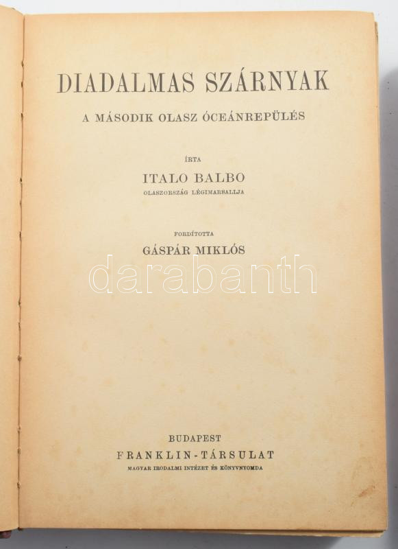 Balbo, Italo (1896-1940): Diadalmas szárnyak. A második olasz óceánrepülés. Ford.: Gáspár Miklós. A Magyar Földrajzi Társaság Könyvtára. Bp., [1934], Franklin, 256 p. + 32 (fekete-fehér fotók) t. +2 (térkép) t.