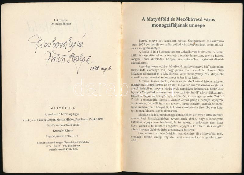 Matyóföld (1976-1977). A Mezőkövesdi városi és járási Művelődési Központ irodalmi és néprajzi munkaközösségének kiadványa. H.n., 1977. Megjelent 800 példányban. Kiadói papírkötés, gerinc sérült, kopottas állapotban.