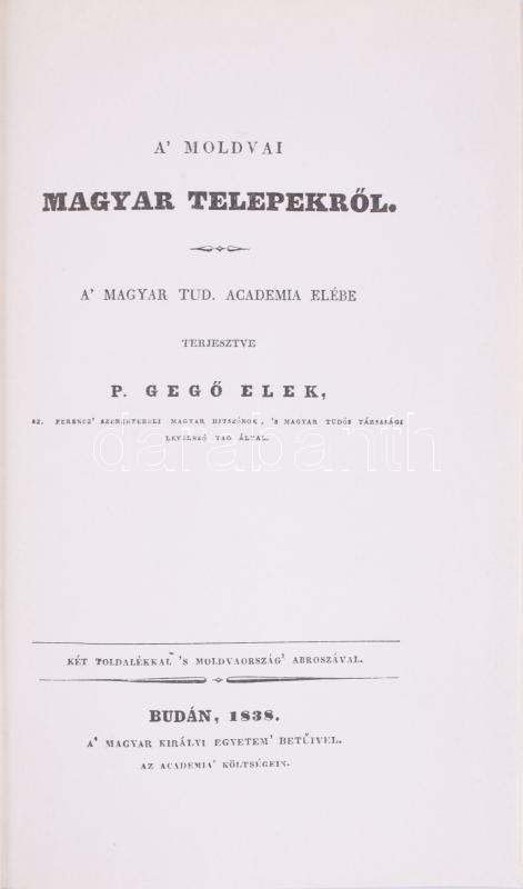 P. Gegő Elek: A moldvai magyar telepekről. Bp., 1987, ÁKV. Reprint kiadás. Kihajtható térkép-melléklettel. Kiadói egészvászon-kötés.