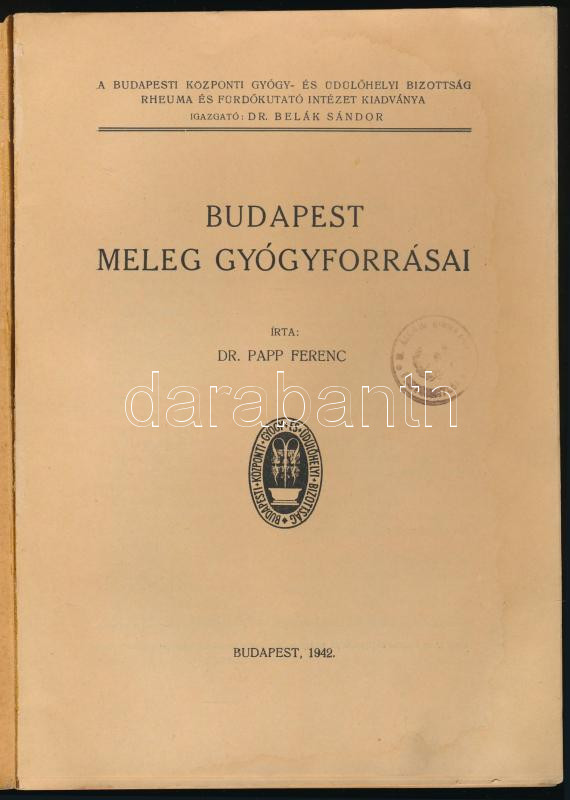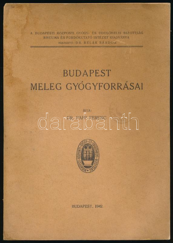 Papp Ferenc: Budapest meleg gyógyforrásai. Bp., 1942, Budapesti Központi Gyógy- és Üdülőhelyi Bizottság Rheuma és Fürdőkutató Intézet (Élet-ny.), 252 p.+ 1 (kihajtható térkép) t. Kiadói papírkötés, a borítón kisebb sérüléssel, ázásnyomokkal.