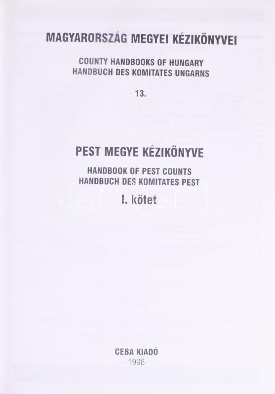Pest megyével kapcsolatos könyvtétel: Pest Megye Kézikönyve I-II. kötet. Bp., 1998, Ceba Kiadó. Kiadói kartonált papírkötésben. +Keleti Ferenc et. al. (szerk.): Pest megye múltjából. Tanulmányok. Bp., 1965, Kiadja Pest Megye Tanácsa. Kiadói nylon-kötésben. Térképmelléklettel, volt könyvtári példány. + Vigh Károly: Vörös Pest vármegye. Pest megye múltjából 4. Bp., 1979, Pest megyei Művelődési Központ és Könyvtár. Kiadói egészvászon-kötés.