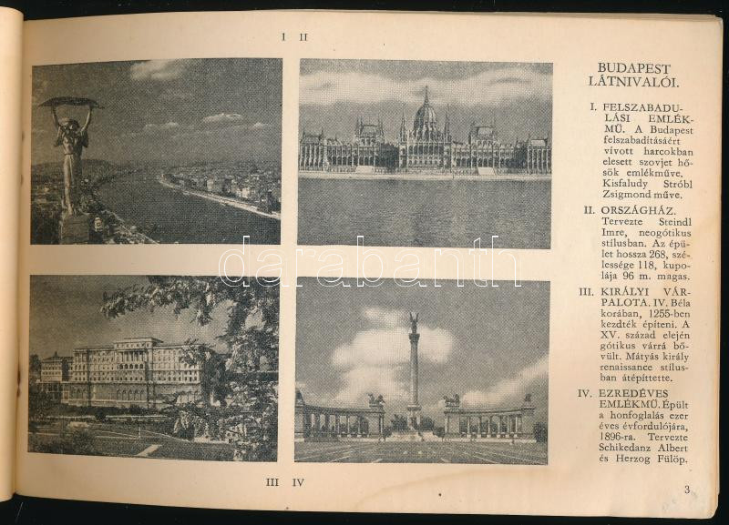 Szöllősi Ernő (szerk.): Budapesti képes térképkalauz. Bp., 1957, Fővárosi Idegenforgalmi Hivatal (Kossuth-ny.), 64 p. Kiadói tűzött papírkötés, kisebb sérülésekkel, ázásnyomokkal.