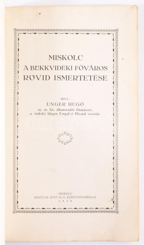 Unger Hugó: Miskolc és környéke. Miskolc a bükkvidéki főváros rövid ismertetése. Miskolc, 1928, Magyar Jövő Rt., 80 p. Fekete-fehér fotókkal. Korabeli reklámokkal. Kiadói illusztrált papírkötésben. Foltos lapokkal