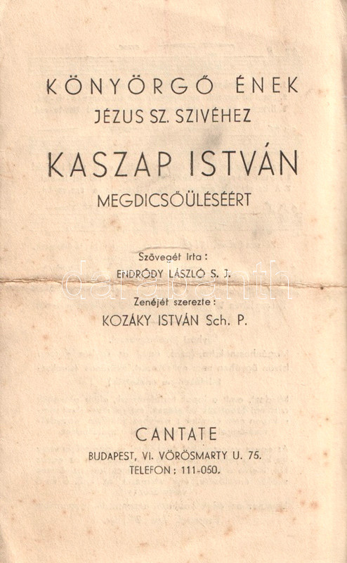 [Aprónyomtatvány] Könyörgő ének Jézus Szent Szívéhez Kaszap István megdicsőüléséért. Szövegét írta: Endrődy László, zenéjét szerezte: Kozáky István.