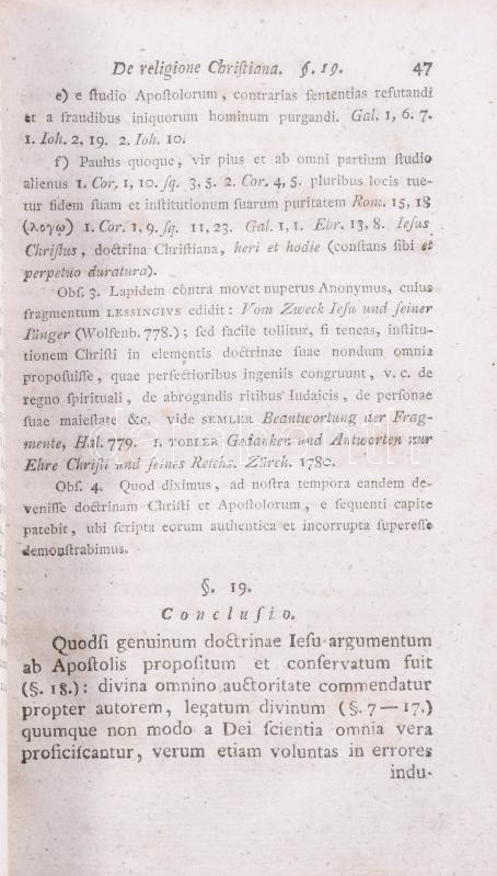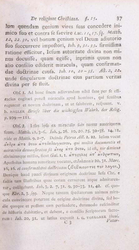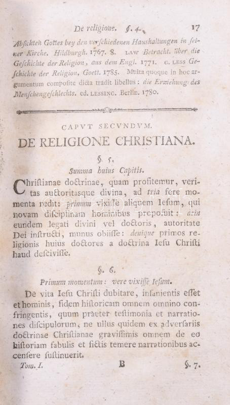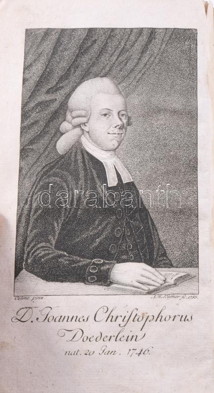 [Döderlein, Johann Christoph (1745-1792)] D. Io. Christoph. Doederlein: Institutio theologi christiani in capitibus religionis theoreticis nostris temporibus accomodata. Pars prior. Norimbergae et Altorfi, 1791, Monath et Kussler, 1 (rézmetszetű címkép) t.+ XXII+568 p. Latin nyelven. Félbőr-kötésben, festett lapélekkel, viseltes borítóval és gerinccel, helyenként kissé foltos lapokkal, az elülső szennylapon 1817-es, illetve 1853-as bejegyzésekkel.