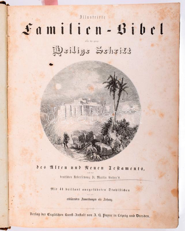 Illustrirte Familien-Bibel des Alten und Neuen Testaments nach der deutschen Übersetzung Dr. Martin Luther's Mit erklärenden Anmerkungen. Leipzig-Dresden, 1816, Verlag Der Englischen Kunst Anstalt von A. H. Payne, 669p. 64p. Korabeli aranyozott gerincű félbőr kötésben