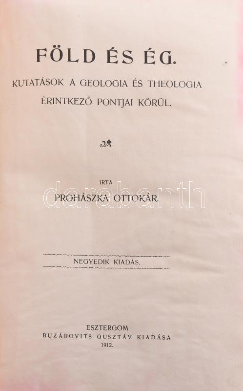 Prohászka Ottokár: Föld és ég. Kutatások a geologia és theologia érintkező pontjai körül. Esztergom, 1912, Buzárovits Gusztáv, IX+(3)+430 p. Félvászon-kötésben, kissé viseltes borítóval és gerinccel, vetemedett kötéstáblákkal, kissé hullámos lapokkal.