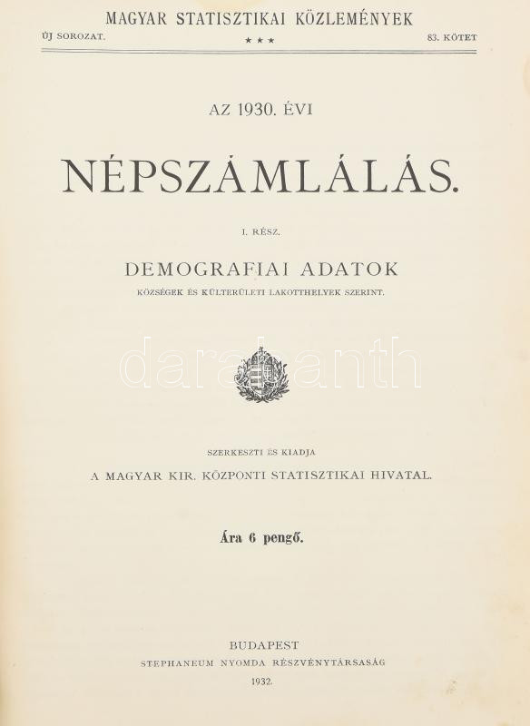 1930 Magyar Statisztikai Közlemények: Az 1930. évi népszámlálás I. rész. Demográfiai adatok. Szerkeszti és kiadja a Magyar Kir. Központi Statisztikai Hivatal. Magyar Statisztikai Közlemények 83. kötet. Bp.,1932, Stephaneum Nyomda Rt., XXII+429+4 p. Kiadói vászonkötésben.
