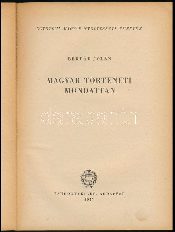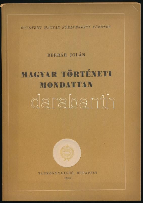 Berrár Jolán: Magyar történeti mondattan. Egyetemi magyar nyelvészeti ... https://www.darabanth.com/de/514-Auktion-Philatelie-Postkarten-Numismatik-Kunstwerke-Bucher-Schreibwaren-Schmuck/515.0/Bucher/Bucher-Sozialwissenschaften~624/Berrar-Jolan-Magyar-torteneti-mondattan-Egyetemi-magyar-nyelveszeti-fuzetek-Bp-1957-Tank~II3463997