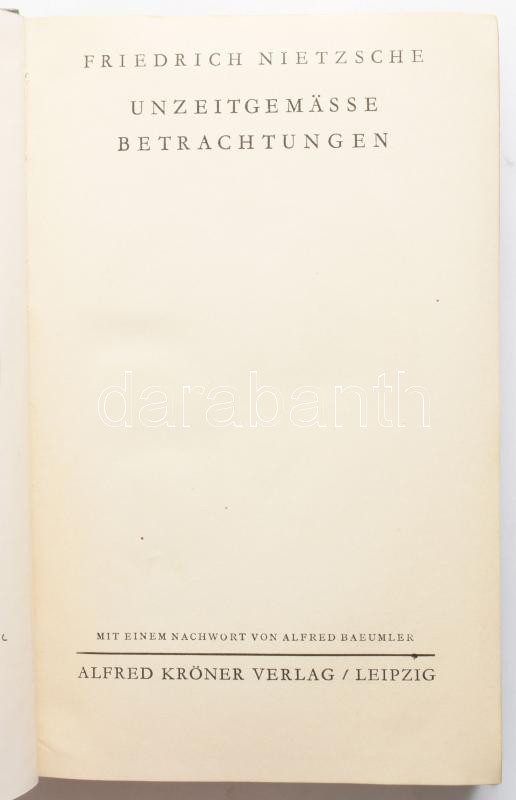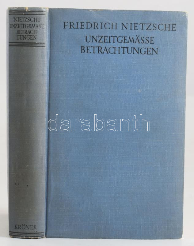 Nietzsche, Friedrich: Unzeitgemässe Betrachtungen. [Korszerűtlen elmélkedések.] Leipzig,1930.,Alfred Körner. Német nyelven. Kiadói egészvászon-kötés. + Peter Sloterdijk: A gondolkodó a szÃnpadon. A JÓ HÃr megjavÃtásáról. Nietzsche-tanulmányok. Vajda Mihály elÅ‘szavával. Ford.: Bendl Julia, Kurdi Imre. Helikon Huszonegy. [Bp.], 2001, Helikon. Kiadói papÃrkötés.