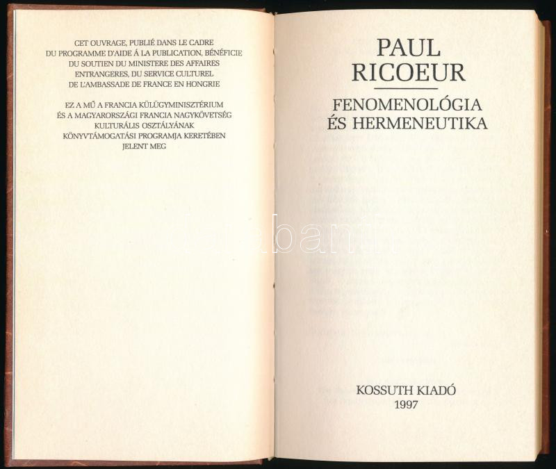 Paul Ricoeur: Fenomenológia és hermeneutika. Összeáll., ford., a tanulmányt és a jegyzeteket írta: Mezei Balázs. Bp., 1997, Kossuth. Első magyar kiadás. Kiadói kartonált papírkötés.
