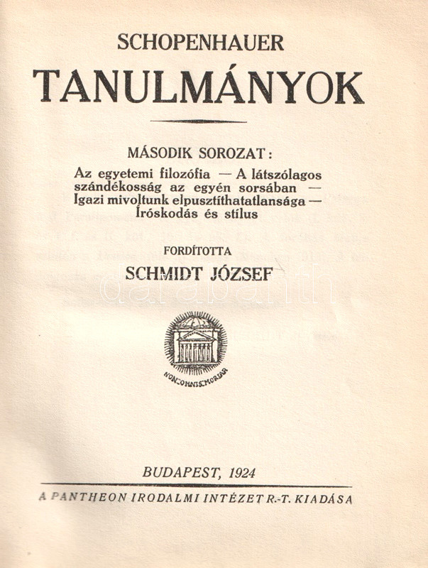 Schmidt József kétkötetes Schopenhauer-fordítása a német filozófus "Parerga und Paralipomena" című művéből válogatja kisebb-nagyobb tanulmányait. Bár az egyes tanulmányok nem tartoznak a schopenhaueri életmű középponti darabjai közé, a rendszerező mélységet itt a szerző szórakoztatóan epés megjegyzései pótolják: ebben a szellemben írja meg Schopenhauer a maga sajátos gondolatait a Kant utáni egyetemi filozófiaoktatás buktatóiról, illetve a nyelvújítók és stiliszták szépelgéseiről.