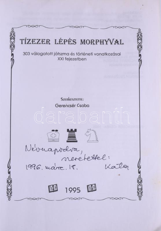 Gerencsér Csaba: Tízezer lépés Morphyval. 303 válogatott játszma és történeti vonatkozásai XXI fejezetben. Szerk.: - -. [Bp.,]1995,[EKJB], (Veszprém, Veszprémi-ny.) Kiadói papírkötés, kopott borítóval.