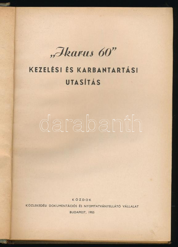 ,,Ikarus 60" kezelési és karbantartási utasítás. Bp., 1955, KÖZDOK, 164 p. Oldalszámozáson kívül kihajtható ábrákkal. Kiadói egészvászon-kötés, kissé viseltes borítóval, kissé vetemedett kötéstáblákkal, tulajdonosi bejegyzéssel. Megjelent 1060 példányban. (Ritka!)