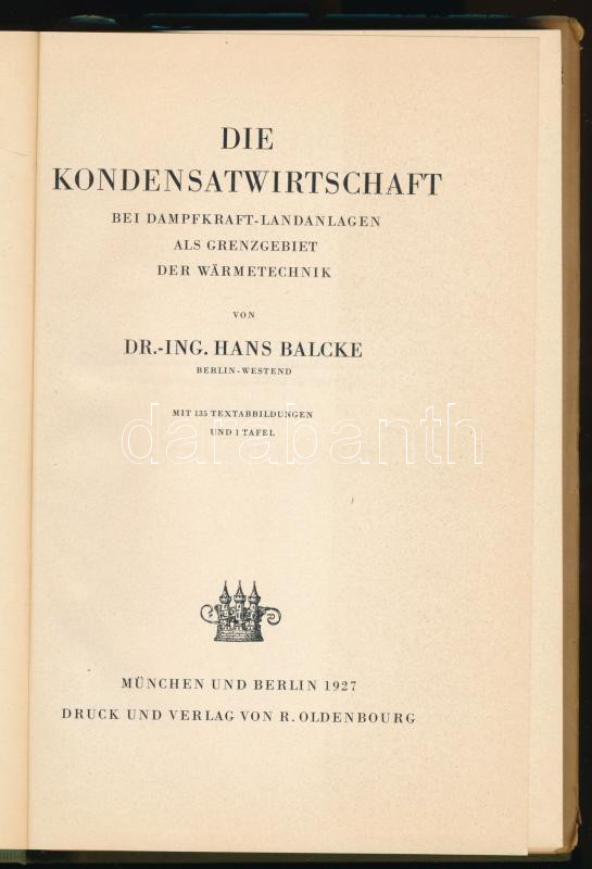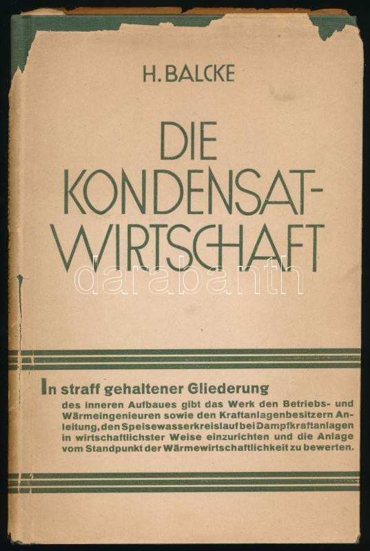Balcke, Hans: Die Kondensatwirtschaft bei Dampfkraft-Landanlagen als Grenzgebiet der Wärmetechnik. München-Berlin, 1927, R. Oldenbourg, XI+(1)+219+(1) p.+ 1 (kihajtható) t. Fekete-fehér képekkel, ábrákkal illusztrálva. Német nyelven. Kiadói aranyozott egészvászon-kötés, nagyrészt jó állapotban, szakadt, két részre vált kiadói papír védőborítóban.