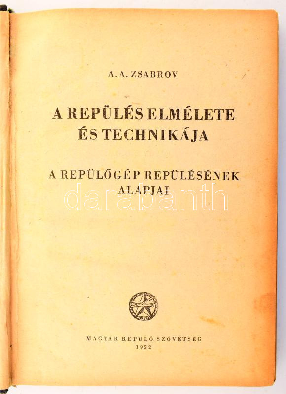Zsabrov: A repülés elmélete és technikája. A repülőgép repülésének alapjai. Ford.: Nagy Ernő. Bp., 1952, Magyar Repülő Szövetség,263+1 p. Szövegközti illusztrációkkal. Kiadói félvászon-kötés, kopott, foltos borítóval.