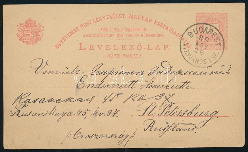 Beschreibung: 1889 5kr díjjegyes levelezőlap "BUDAPEST VIZIVÁROS I.SZ." - Szentpétervár (kiállítási minőség)