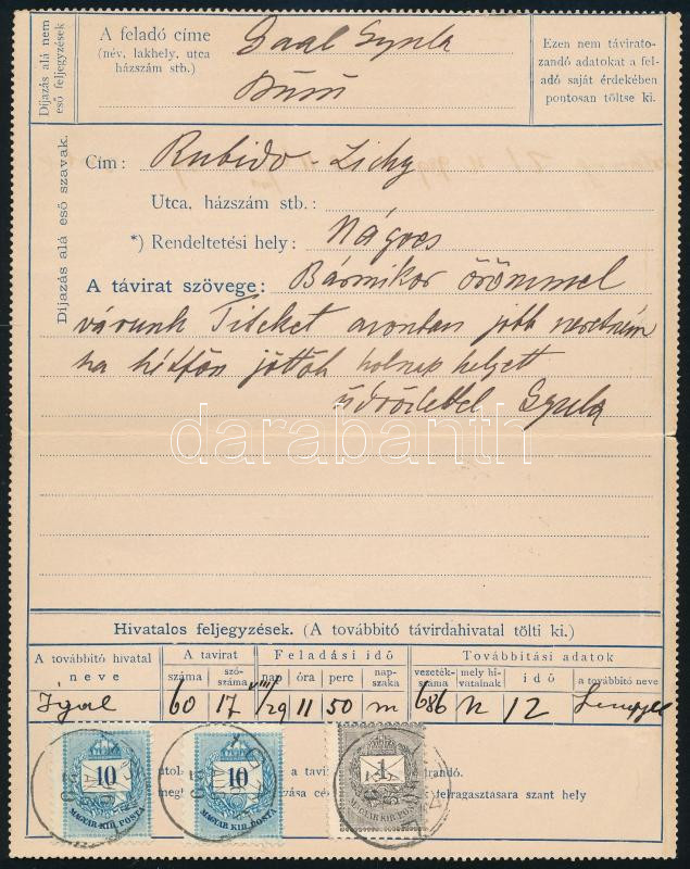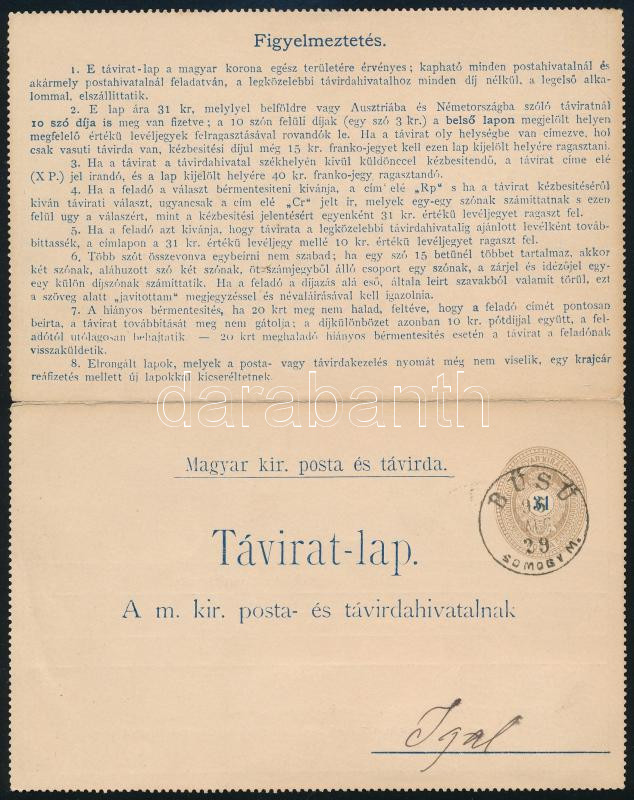 1896 Táviratlap 2 x 10kr + 1kr bélyeggel, "BÜSÜ / SOMOGY M."... https://www.darabanth.com/de/514-Auktion-Philatelie-Postkarten-Numismatik-Kunstwerke-Bucher-Schreibwaren-Schmuck/515.0/Erlesene-Lose-und-Sammlungen-Ungarn/Einzelne-Gebotslose-Ungarn~1/1896-Taviratlap-2-x-10kr-plus-1kr-belyeggel-BUSU-SOMOGY-M-IGAL-Magocs~II3476359