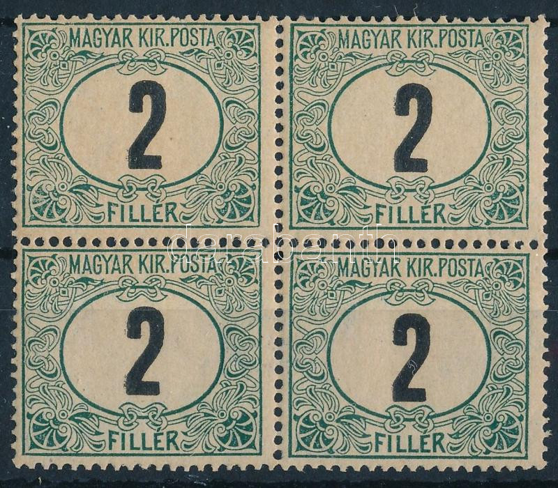 Beschreibung: 1905 Zöldportó "B" 2f postatiszta négyestömb 4. vízjelállással (44.000+++)
