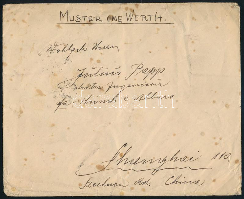 1939 "Minta érték nélkül" küldemény KÍNÁBA 5 db Szent István bélyeggel, 12f bérmentesítéssel "BUDAPEST" - "SHANGHAI". Rendkívül ritka küldeményfajta, ritka destináció!!