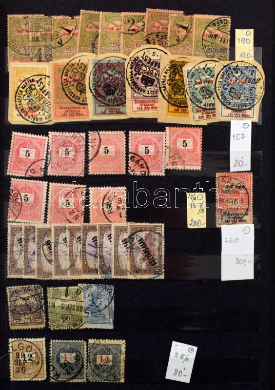 Beschreibung: 1881-1938 Krajcárostól több példányos pecsételt sorok és darabok, 4 lapos közepes berakóban