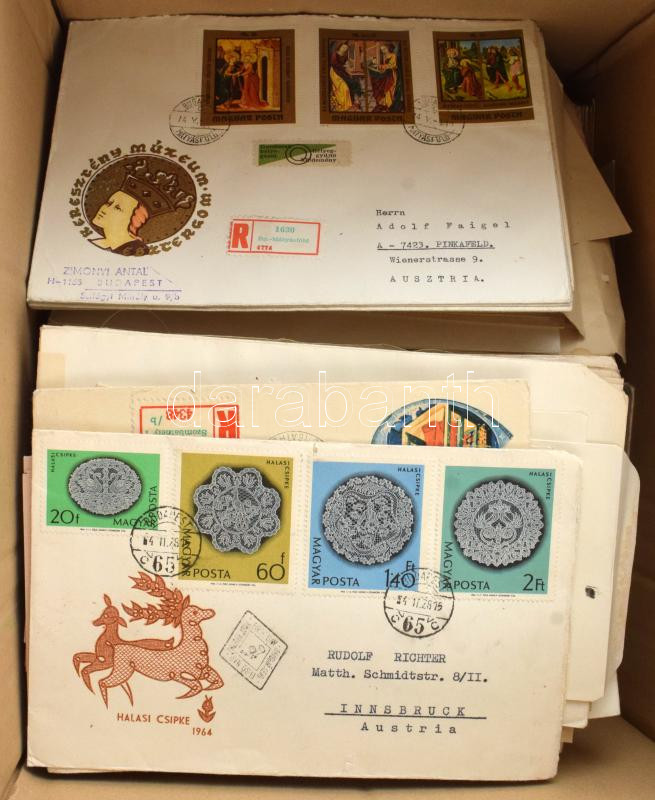Főleg modern magyar küldemények, köztük FDC-k, teljes sorokkal és blokkokkal bérmentesített köznapi és ajánlott levelek, kisalakúak, sokféle motívum, kartondobozban