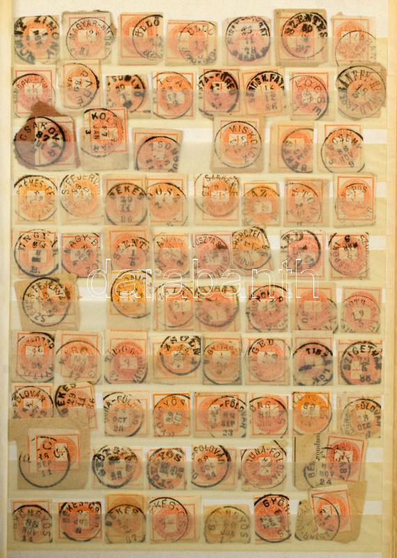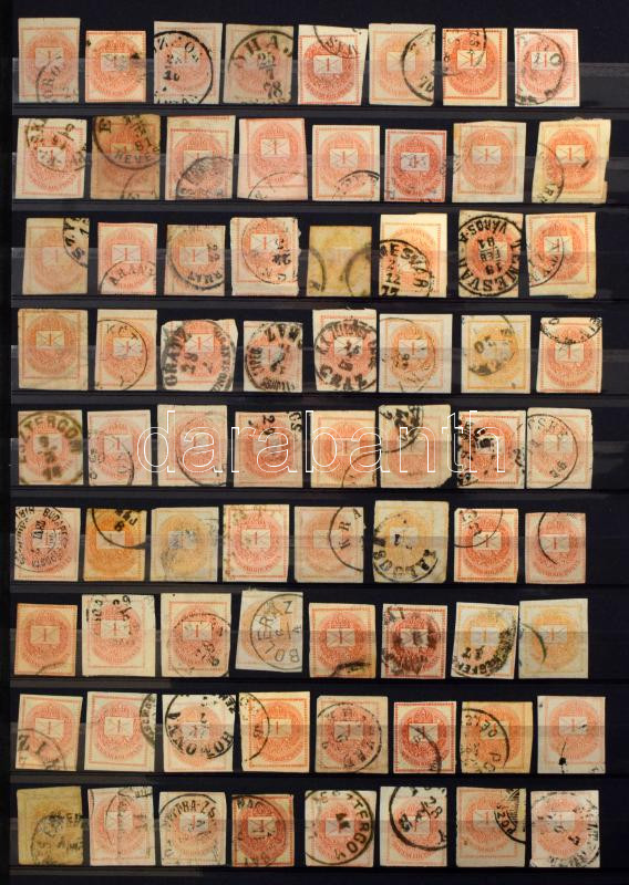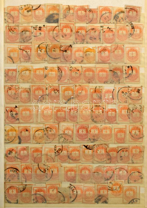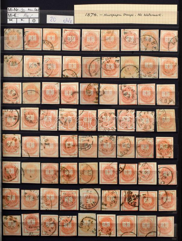 Beschreibung: Krajcáros hírlapbélyeg több ezer darabos hatalmas tétel sok színváltozattal, közte szép / olvasható bélyegzések, 2 db A/4es berakóban
