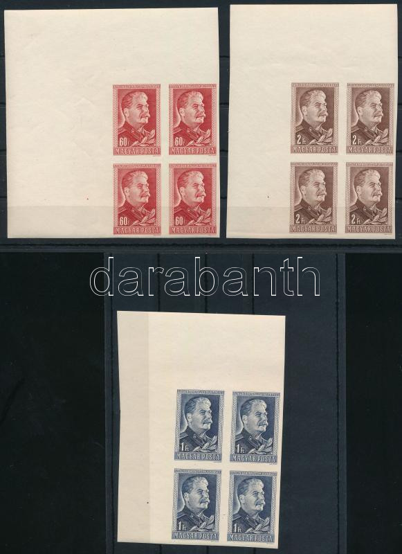 1949/1950 J. V. Sztálin I. vágott sor ívsarki négyestömbökben, luxus m... https://www.darabanth.com/de/514-Auktion-Philatelie-Postkarten-Numismatik-Kunstwerke-Bucher-Schreibwaren-Schmuck/515.0/Erlesene-Lose-und-Sammlungen-Ungarn/Ungezahnte-Satze-Blocke-Gebotslose~2/19491950-J-V-Sztalin-I-vagott-sor-ivsarki-negyestombokben-luxus-minosegben-22000~II3483416