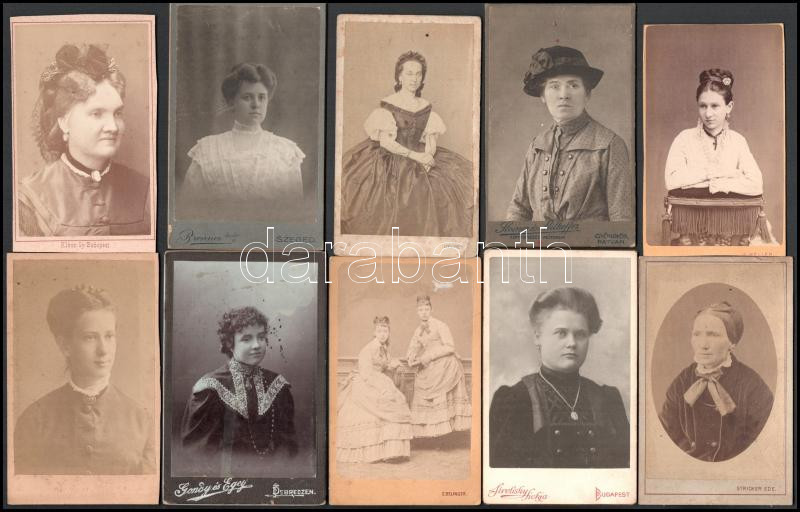 10 db hölgyeket ábrázoló vizitkártya, különféle műtermekből (közte Décsey Ede, Kolozsvár-Arad; Divald Károly, illetve Stricker Ede, Budapest; stb.), vegyes állapotban