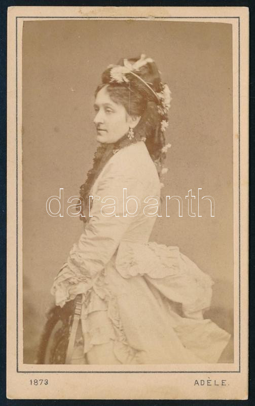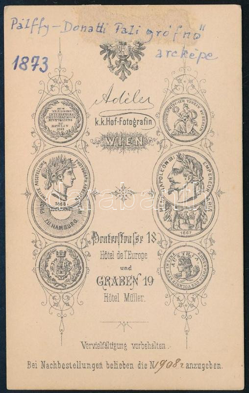 1873 Pálffy-Donati Paulina (1829-1881) grófnő, gróf Pálffy Rudolf (1822-1878) feleségének portréja, vizitkártya Adéle bécsi műterméből, a hátoldalon feliratozva, 10,5x6,5 cm