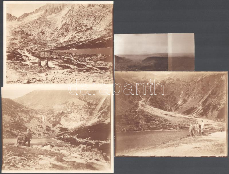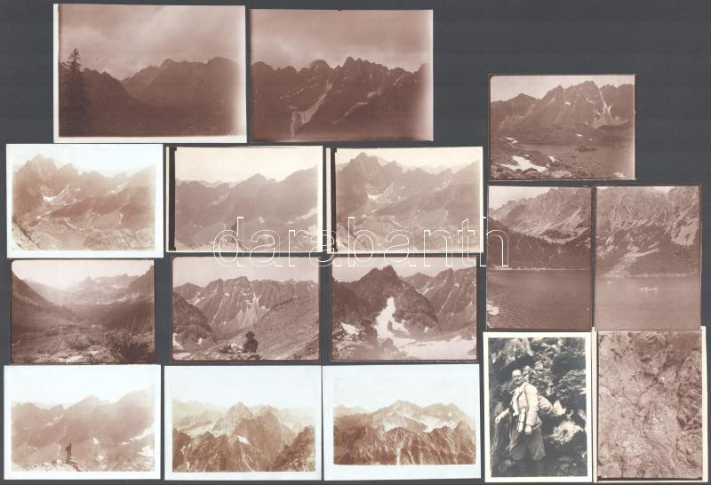 1927-1931 Magas-Tátra, látványos felvételek a hegyekről, völgyekről, tavakról: Gerlachfalvi-csúcs, Poprádi-tó, Menguszfalvi-völgy, Hunfalvy-hágó, Lomnici-csúcs, Felkai-tó, stb.; összesen 20 db fotó, többségük a hátoldalon részletesen feliratozva, 8x5,5 cm és 17x13 cm között / 1927-1931 High Tatras, Vysoké Tatry, scenic photos of the mountains, valleys, lakes: Gerlachovský štít, Popradské pleso, Mengusovská dolina, Lomnický štít, Velické pleso, etc.; 20 pcs in total, between 8x5.5 cm and 17x13 cm